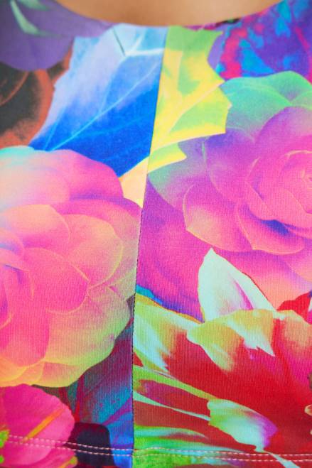 A sports bra with straps in elastic fabric, featuring central seams and elastic at the bottom. In a multicoloured floral print.