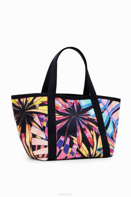 A large tote bag in canvas fabric with a tropical print. Featuring a double handle, pocket and removable inner toiletry bag.