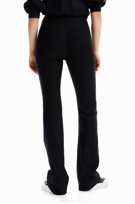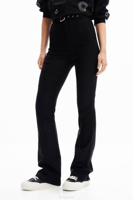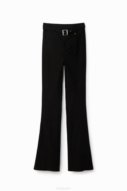 Fitted trousers in plain stretch fabric, flared from the knee with central seams and a belt.