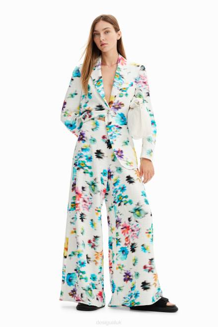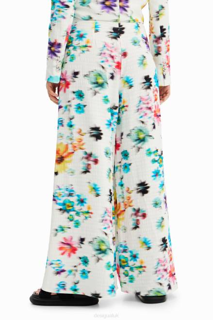 Long trousers with wide legs and a crinkled striped texture. Out-of-focus flower print.