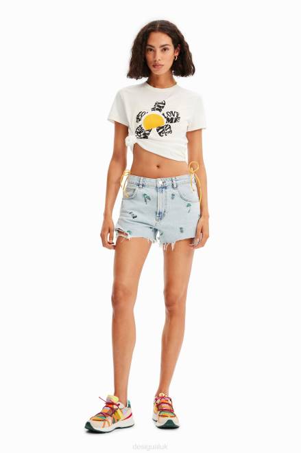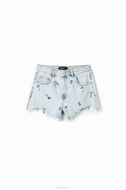 Mid-rise denim shorts with frayed hems and side slits. Featuring tropical embroidery.
