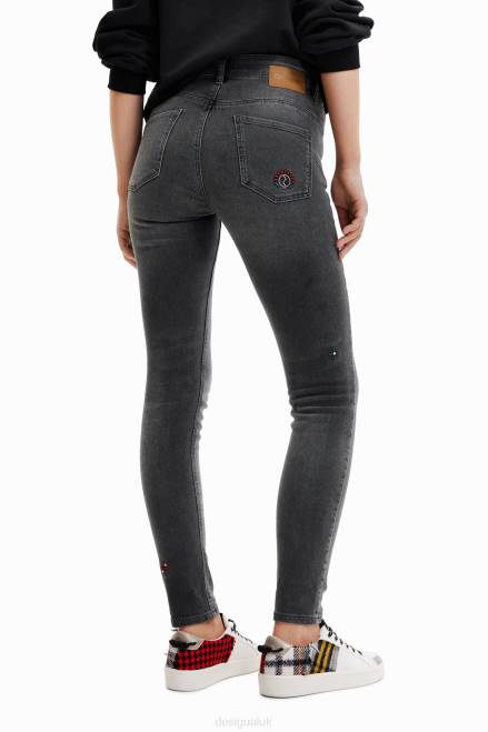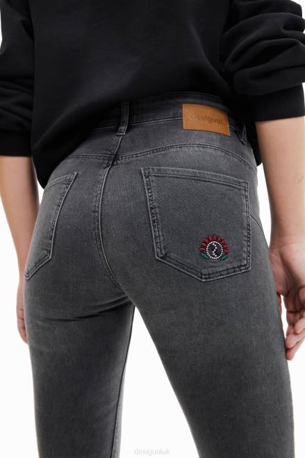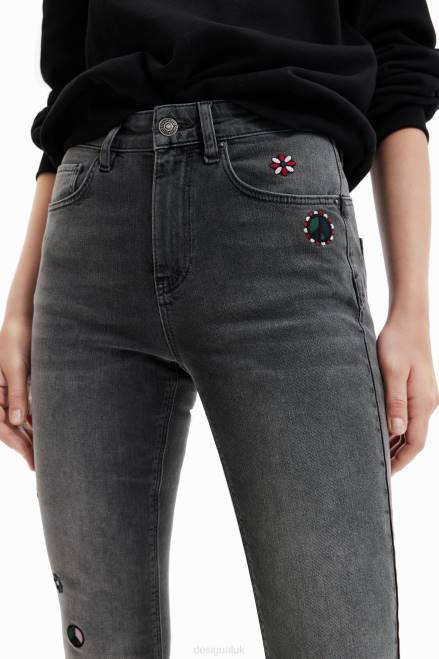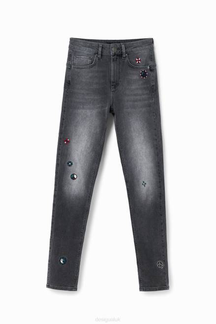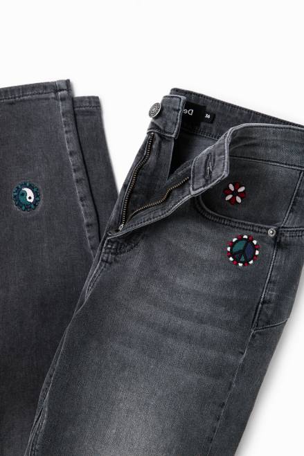 Mid-rise fitted jeans in a very comfortable stretch fabric, with a push-up effect on the bum. Features embroidered details of flowers and symbols.