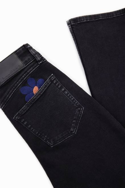 High-waisted jeans with a straight leg and slightly flared hem. Featuring flower embroidery in similar tones inside the back pocket.