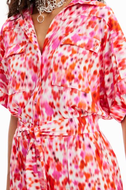 A low-rise boiler suit with short sleeves, wide legs and flowing fabric featuring an out-of-focus floral print.