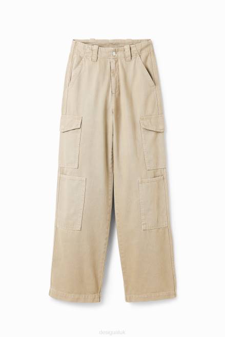 Mid-rise long cargo-style trousers with multiple pockets.