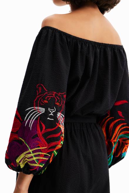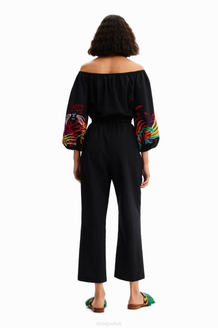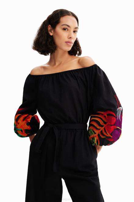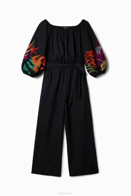 A jumpsuit with exposed shoulders, long puff sleeves with contrasting embroidery, an elasticated waist and a removable belt. Designed by Stella Jean.