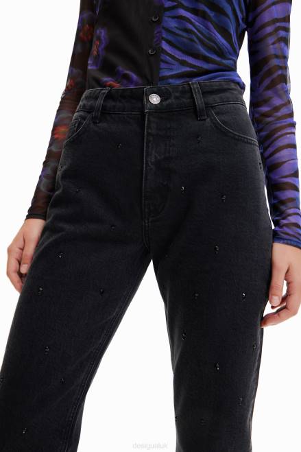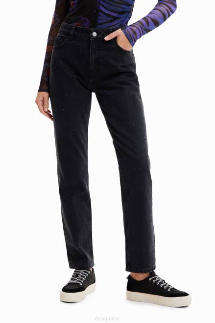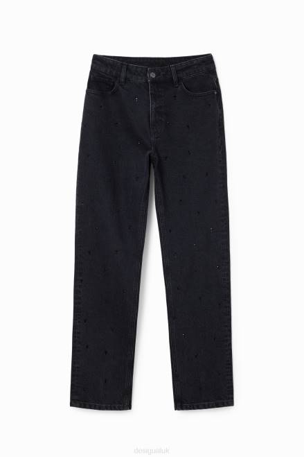 Straight-cut, mid-rise jeans with subtly fitted legs in fabric with a hint of stretch. Featuring rhinestone appliqueing and slits on the hems.