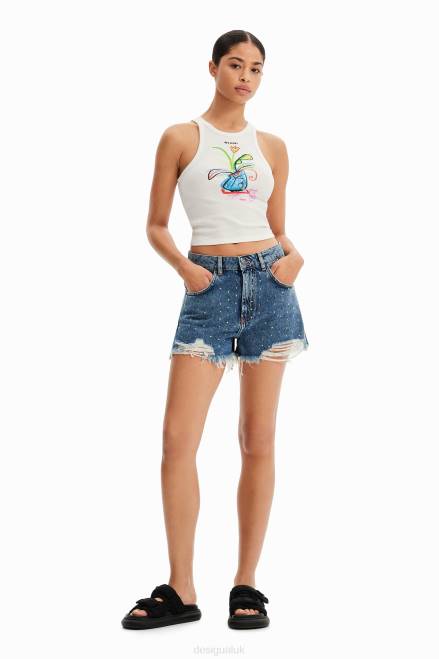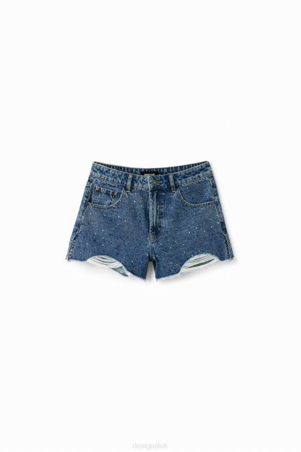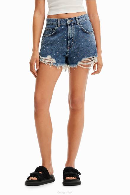Mid-rise denim shorts with multicoloured metallic appliques and a frayed hem with side slits.