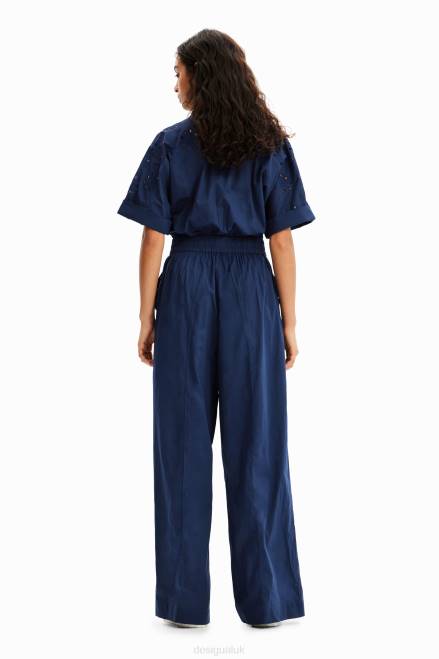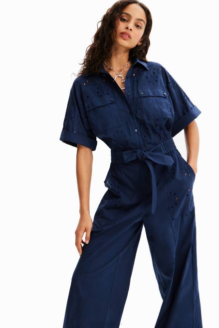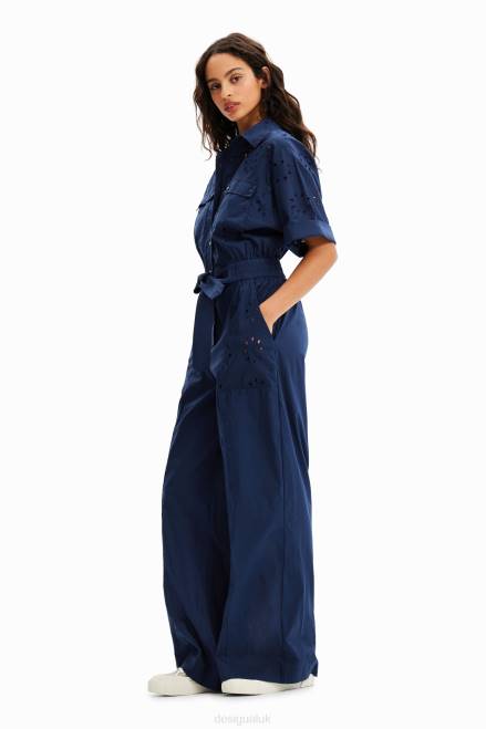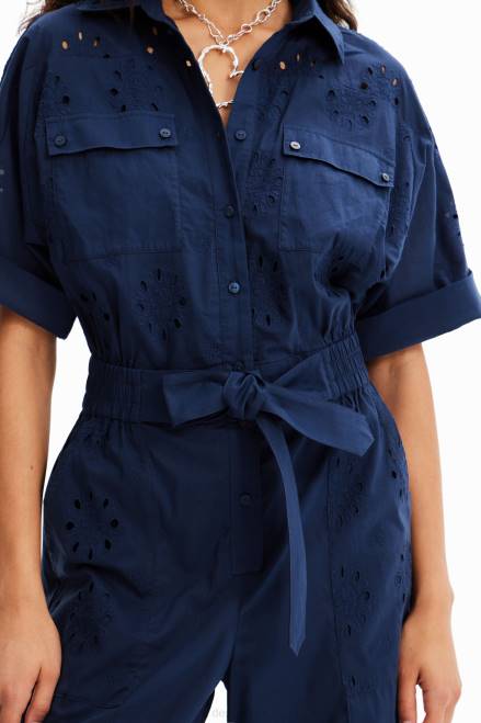 A short-sleeve boilersuit with a low waist and wide legs in cotton fabric with Swiss embroidery.