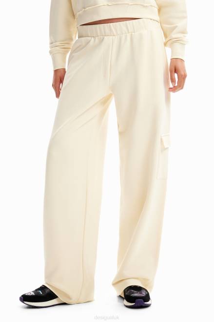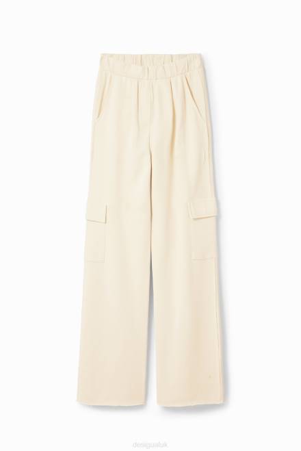 Plain mid-rise cargo-style trousers with wide legs and very comfortable cotton fabric with visible stitching detail.