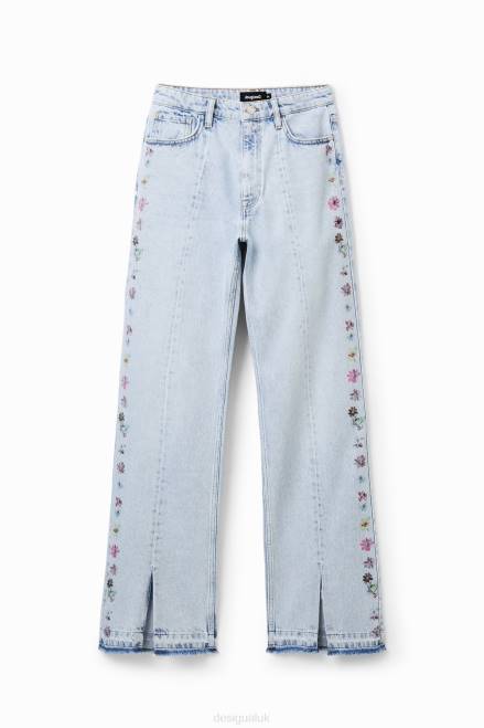 Wide-leg, mid-rise jeans that are fitted at the waist and hips. Featuring a slit on the hem and flower details.