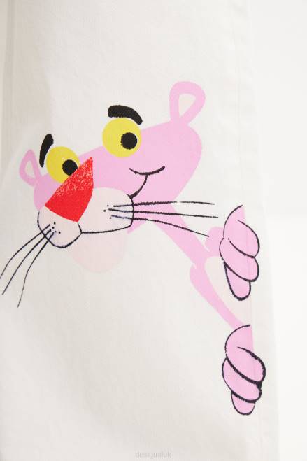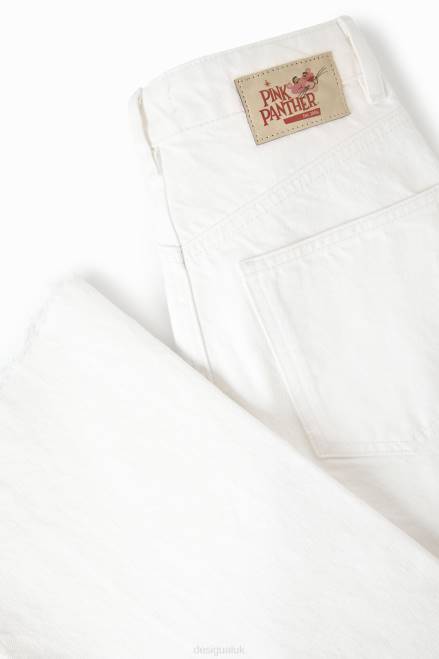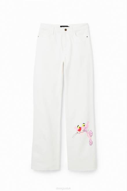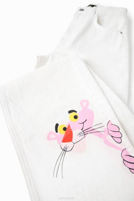 Wide-leg, high-waisted jeans that are fitted at the waist and hips. Featuring a Pink Panther illustration on the leg.