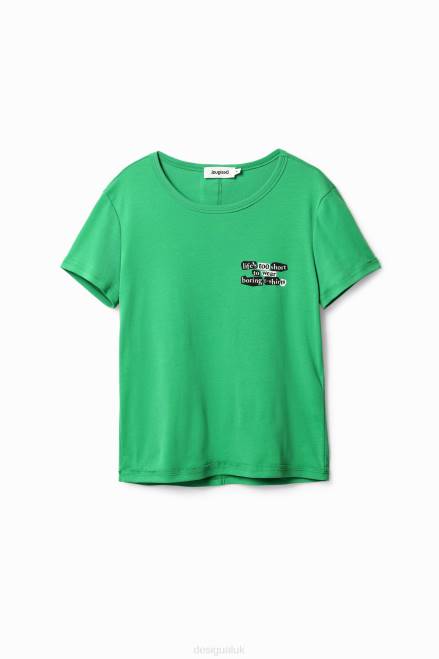 A short-sleeve T-shirt with a front collage-style message print and visible seams.