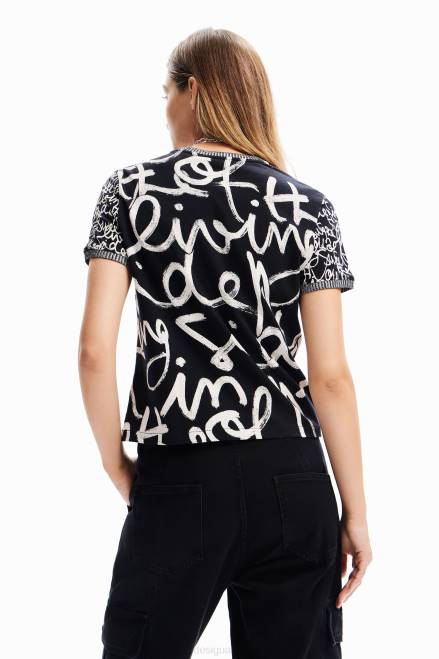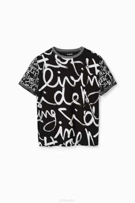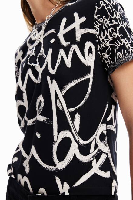 A short-sleeve T-shirt with a two-tone ribbed neck and cuffs and a contrasting message print.