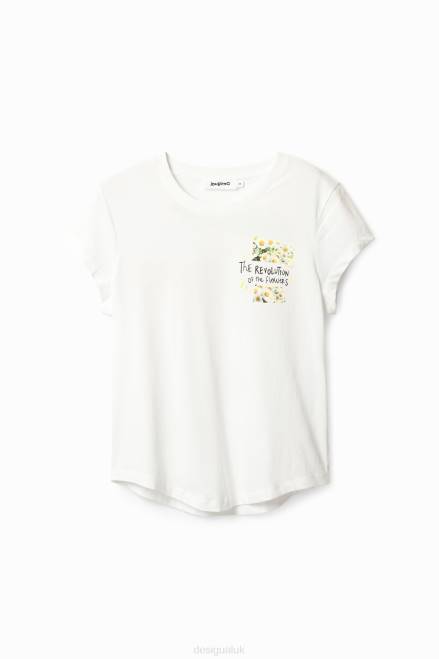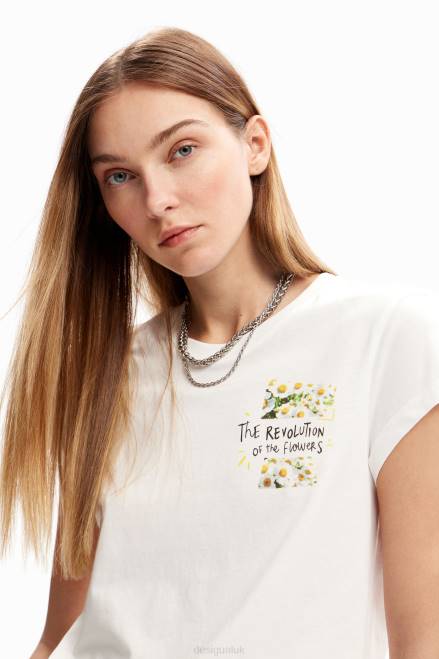 A short-sleeve T-shirt with a floral and message print on the chest and back.