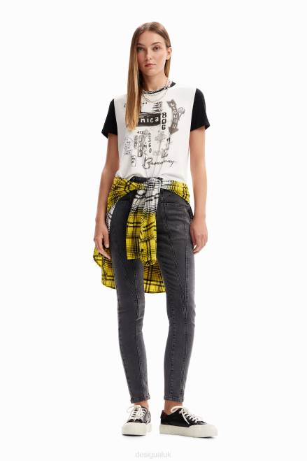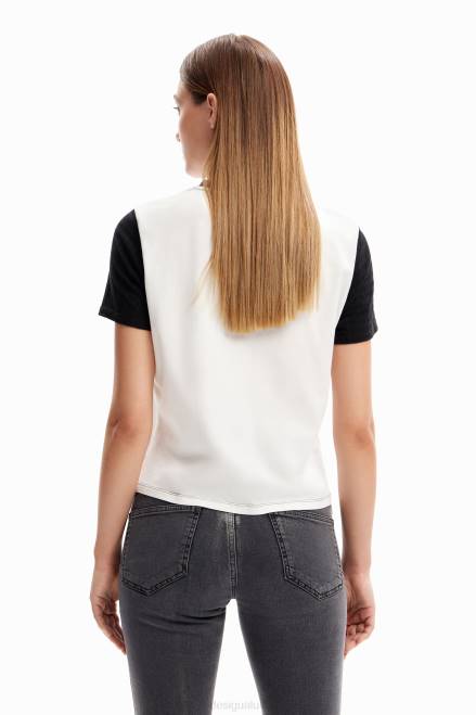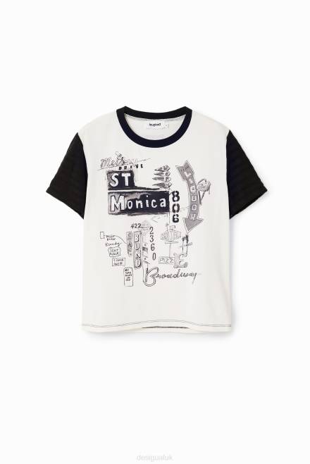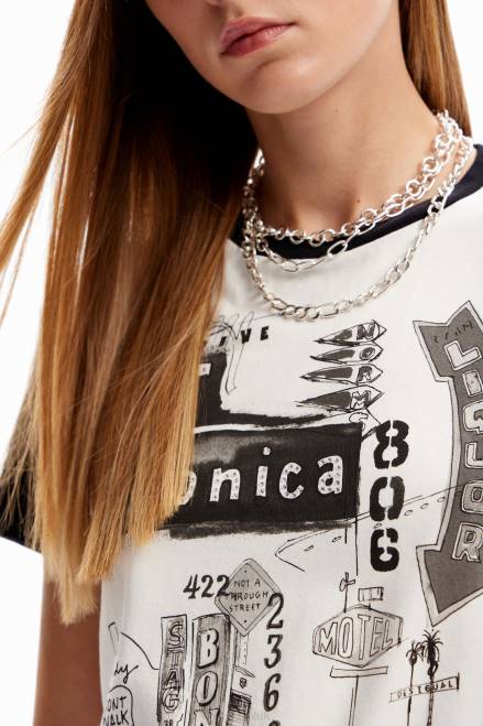 A short-sleeve T-shirt with an illustration print on the front and knit sleeves with stripes and transparency.
