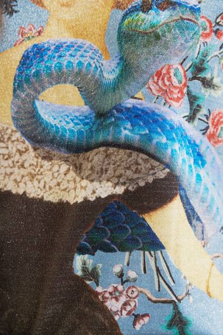 A short-sleeve T-shirt in glossy knit featuring different prints and an arty collage on the front.