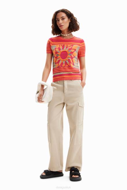 - Knit with front border and flower design in warm tones