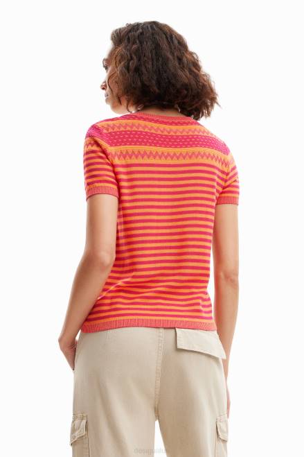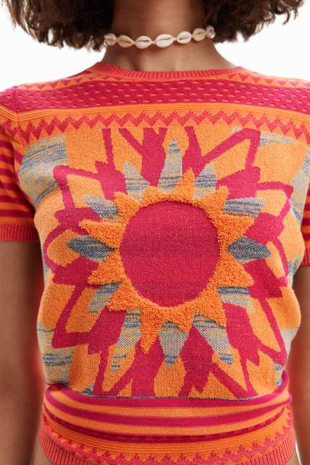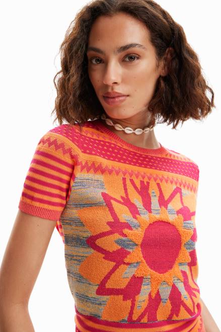 A short-sleeve T-shirt in multicolour knit with borders and a flower on the front.