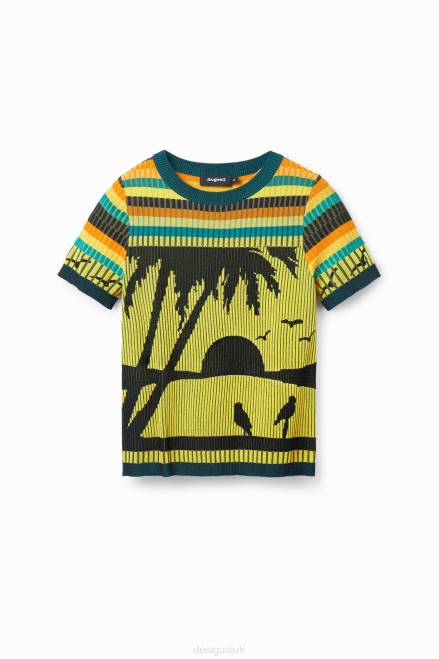 A short-sleeve multicolour ribbed-knit T-shirt with stripes and a tropical landscape motif.