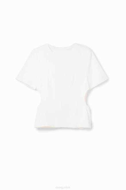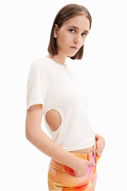 A short-sleeve T-shirt in stretch fabric with side cut-outs and seams details throughout the garment creating a deconstructed T-shirt effect. Designed by Maitrepierre.