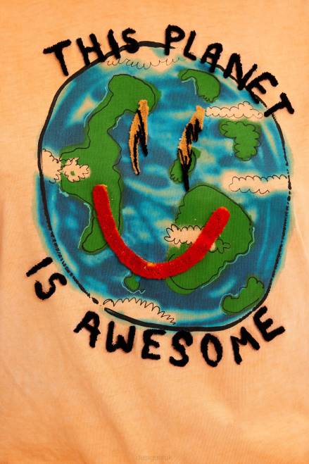 A washed-effect sleeveless T-shirt with an illustration of the Earth and an embroidered message.