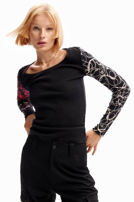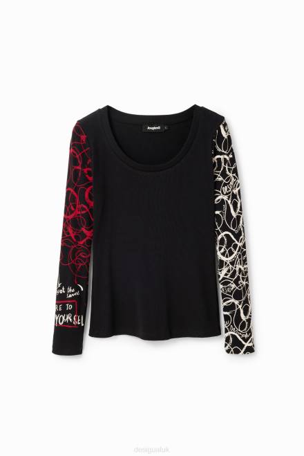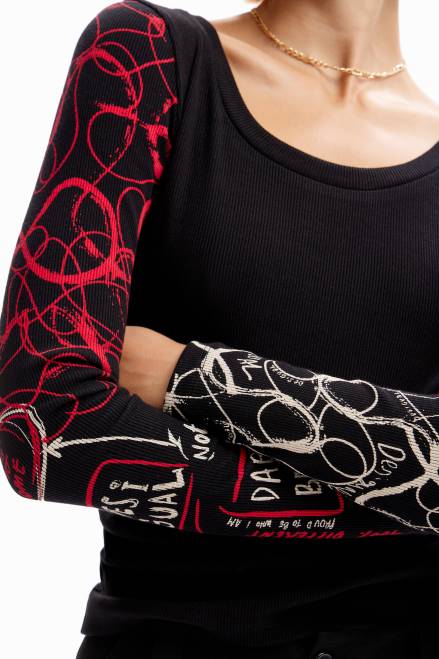 A fitted long-sleeve T-shirt in stretch ribbed knit, featuring a plain body and sleeves with a message print and contrasting brushstrokes.