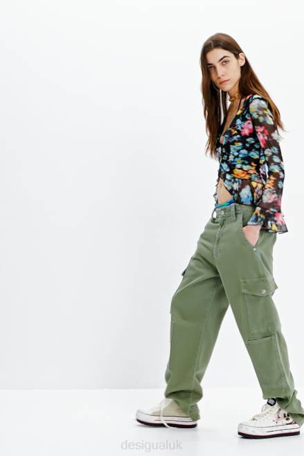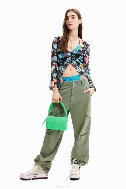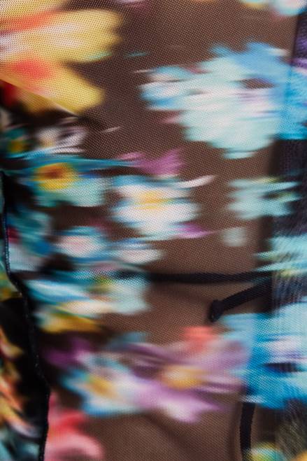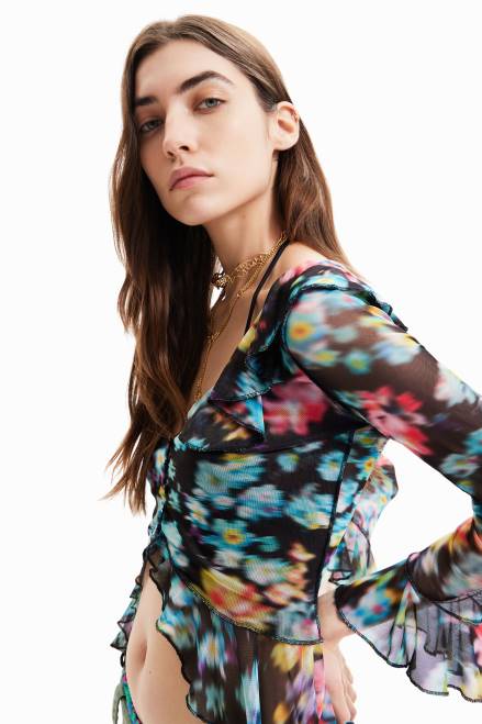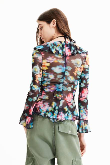 A long-sleeve tulle T-shirt with a floral print and ruffles on the neckline, hem and cuffs.