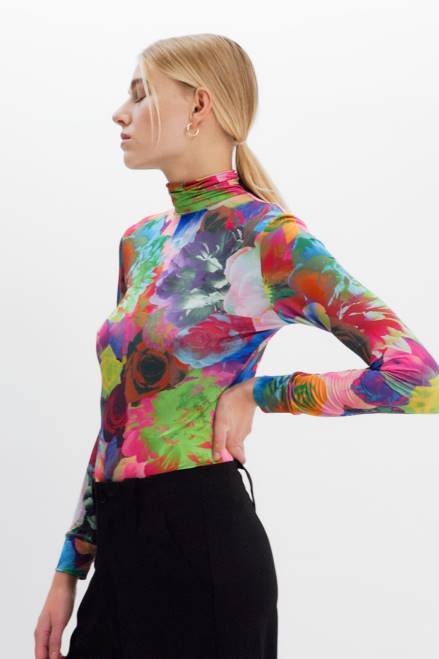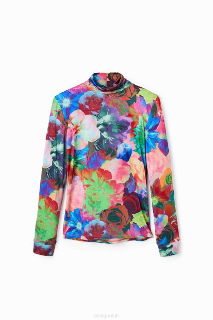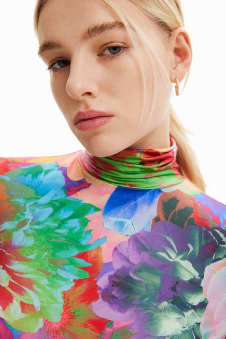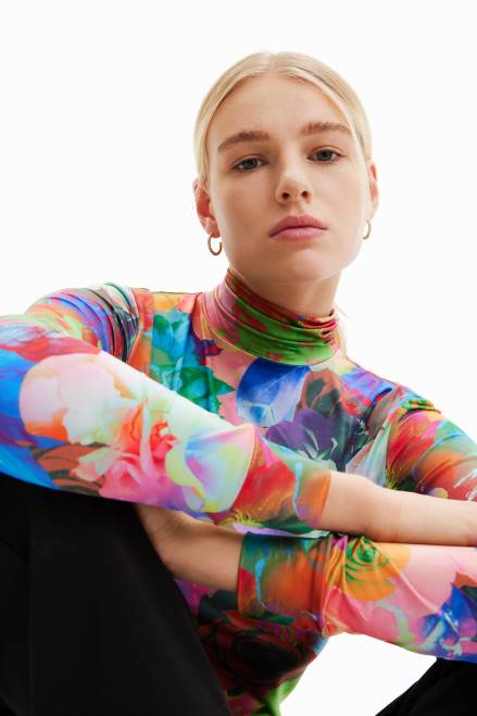 A fitted lomg-sleeve T-shirt with a high neck and floral photographic print.