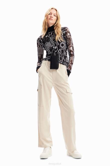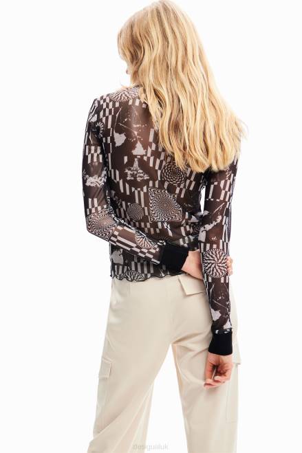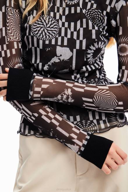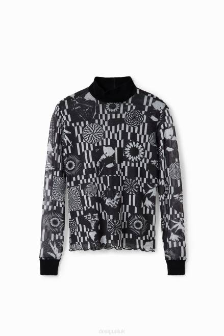 A fitted long-sleeve T-shirt in tulle with a psychedelic New Heritage geometric print, high neck and ribbed cuffs.