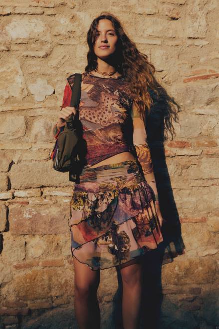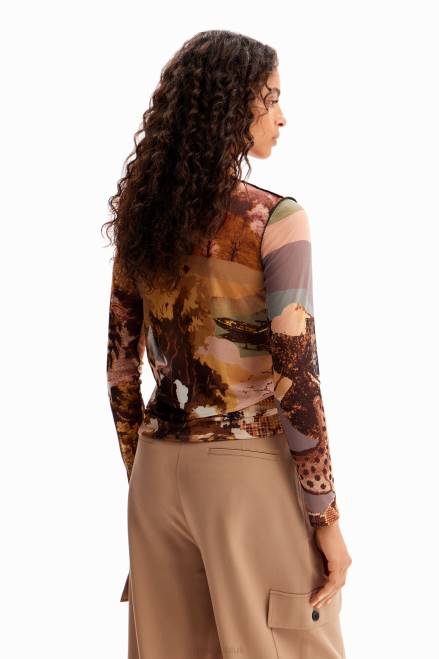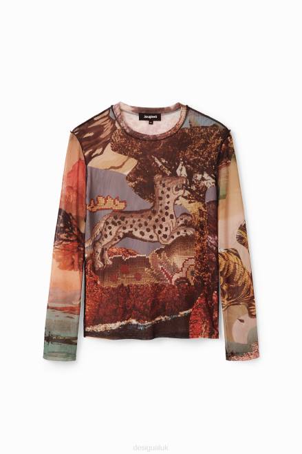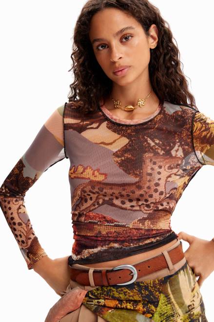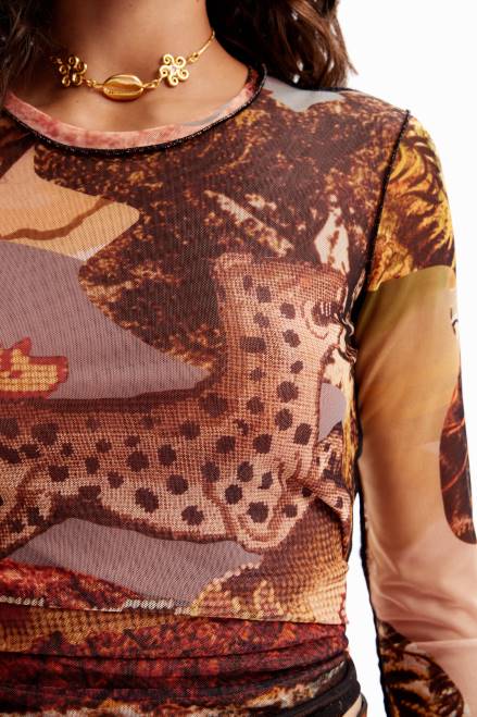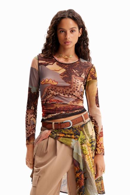 A fitted long-sleeve tulle T-shirt with a tapestry-effect print and contrasting seams. Designed by M. Christian Lacroix.