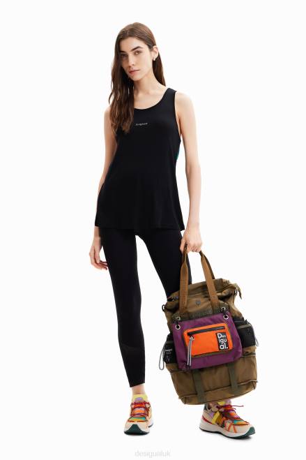 A sport T-shirt with crossed straps, a plain body and transparent mesh in a floral print on the upper back.