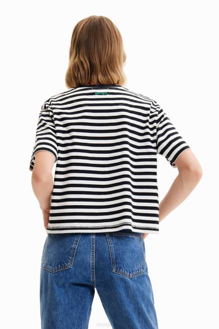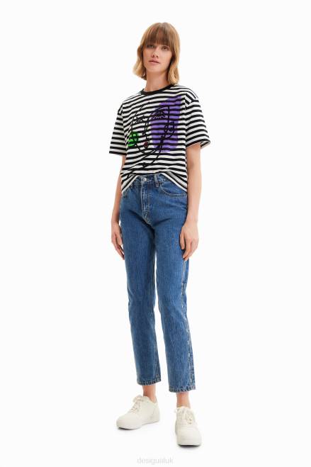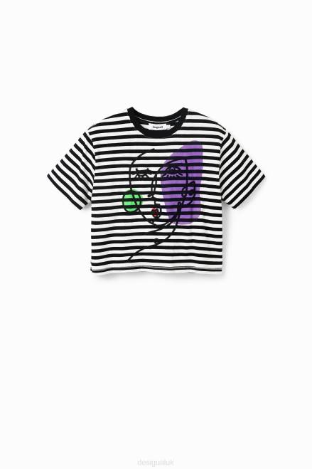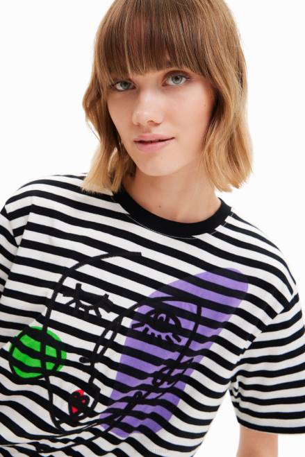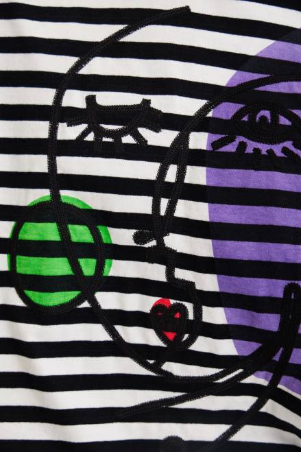 A subtly cropped striped T-shirt with short sleeves and a positional print with arty face embroidery.