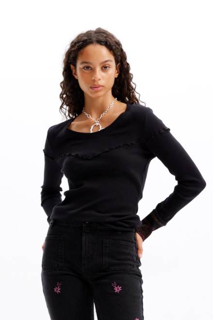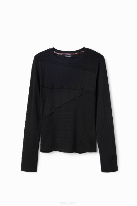A fitted, stretch, long-sleeve T-shirt with embossed seam details and a patchwork of ribbed and openwork pieces.