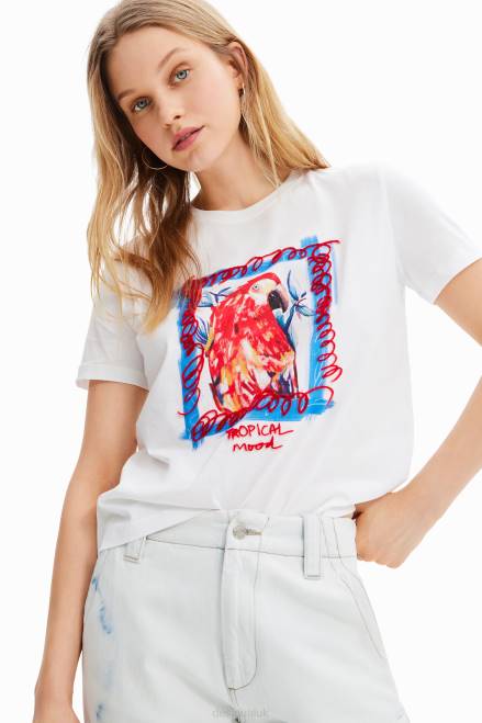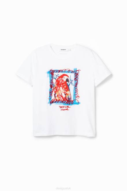 A short-sleeve T-shirt with an arty parrot print on the front and flocked embossed details.