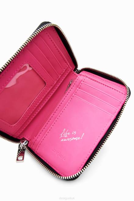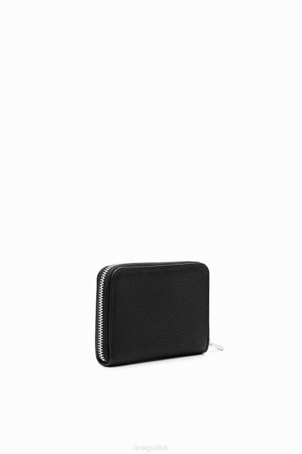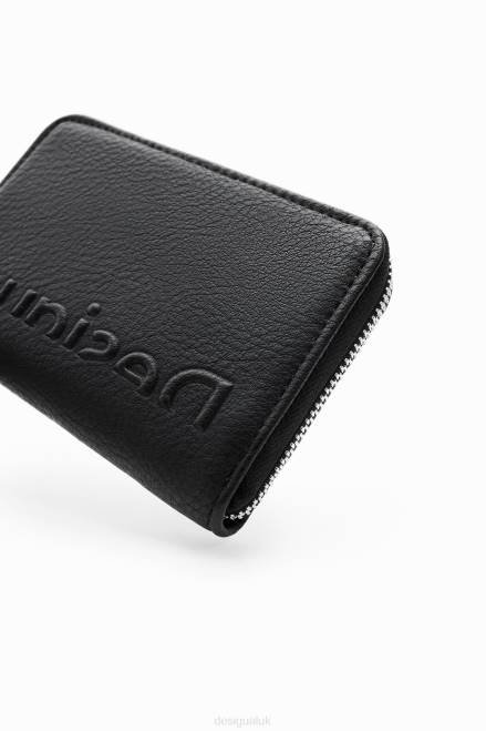 A small wallet in leather-effect fabric with an embossed half logo and several compartments.