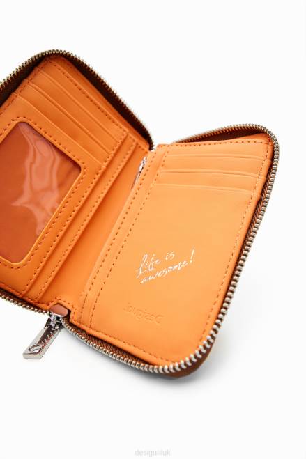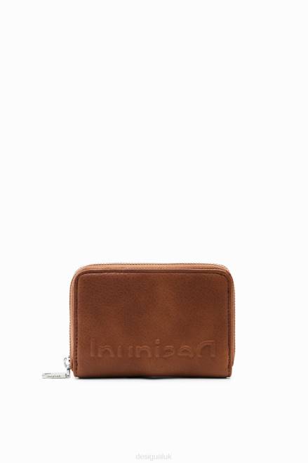 A small wallet in leather-effect fabric with an embossed half logo and several compartments.