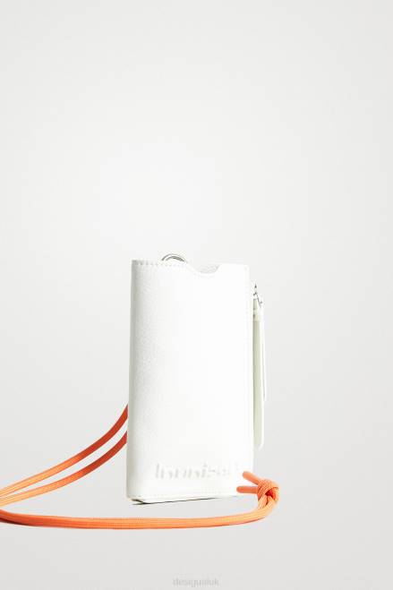 Small, white and practical phone pouch with a side compartment for coins and two sleeves for cards. Featuring a contrasting adjustable strap and tone-on-tone pullers.