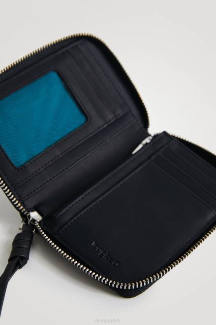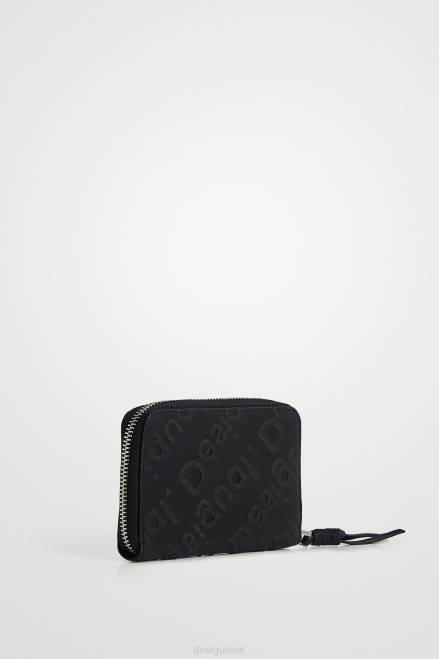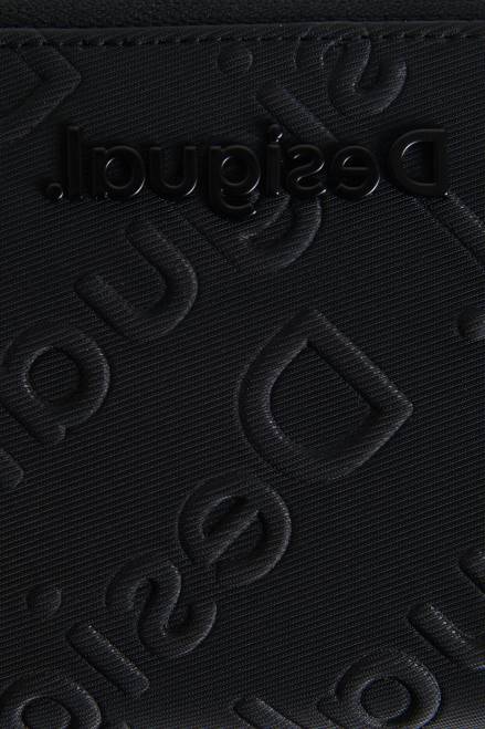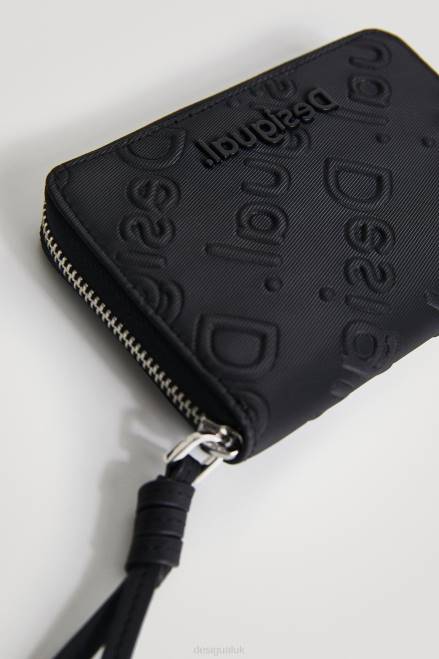 Embossed Desigual logo print on a small black wallet with room for everything: cards, notes and coins. Featuring a tone-on-tone puller and contrasting zip.
